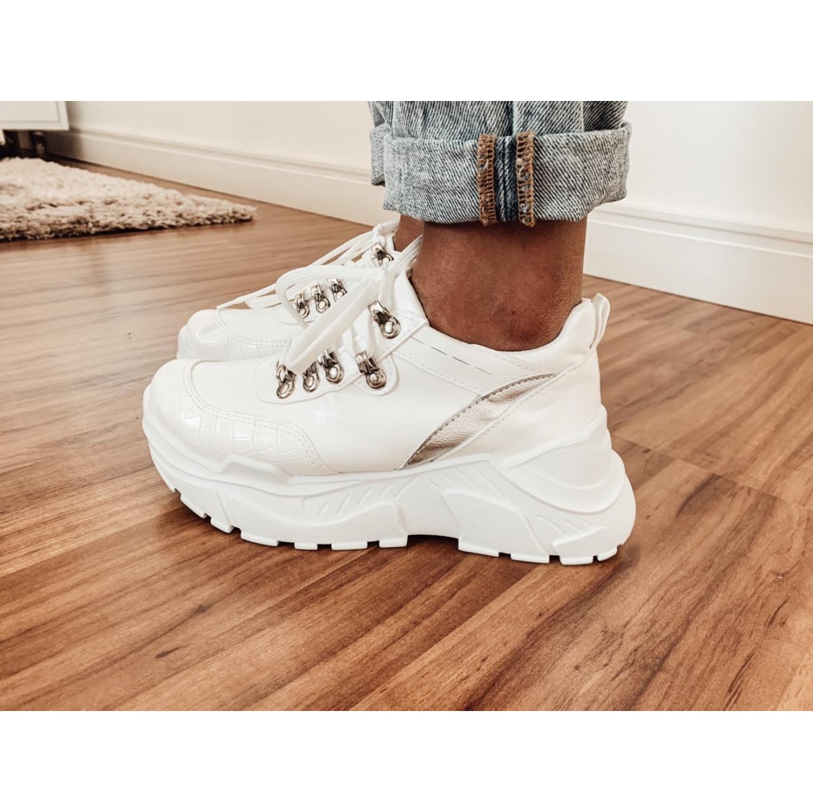 TENIS BRANCO EM NAPA COM DETALHES EM METALIZADO PRATA.