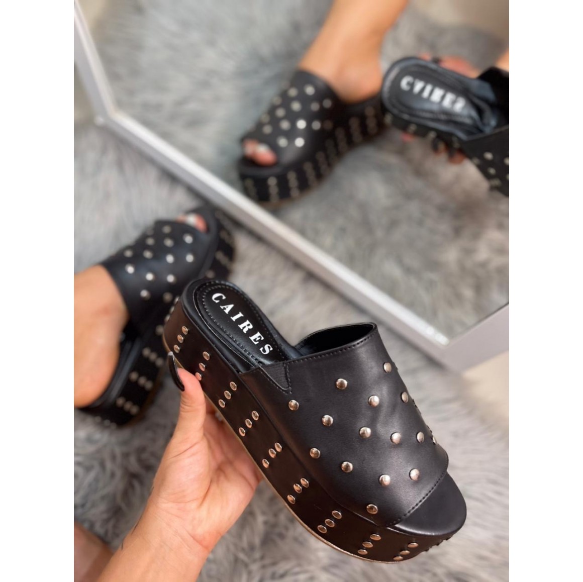 FLAT EM COURO ECOLOGICO E SPIKES REDONDOS PRATA, SALTO DE 5CM